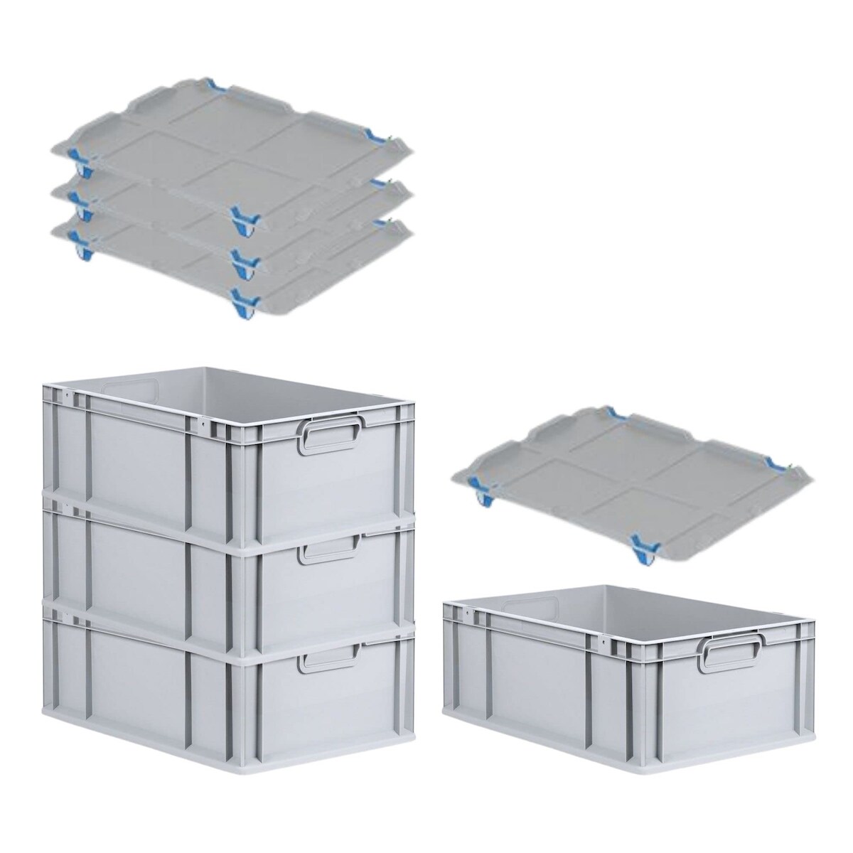 PROREGAL SuperSparSet 4x Eurobox NextGen Economy mit Auflagedeckel & 4x Verschlüsse Blau, Griffe zu, HxBxT 22x40x60cm, 44L, Eurobehälter, Box