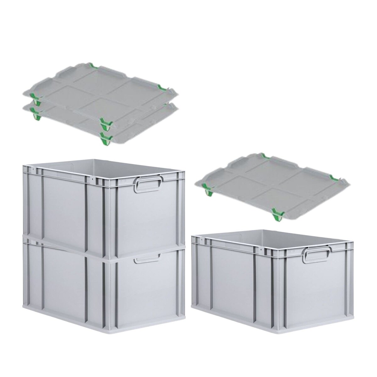 PROREGAL SuperSparSet 3x Eurobox NextGen Economy mit Auflagedeckel & 4x Verschlüsse Grün, Griffe zu, HxBxT 32x40x60cm, 65L, Eurobehälter, Box