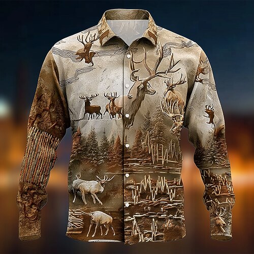 Per uomo Renna Piante foresta Camicia Camicia con Bottoni Manica Lunga Vintage Retrò All'aperto Campeggio Escursionismo Caccia Primavera Autunno Collo ripiegato Stampa 3D camicie con colletto