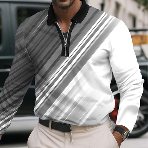 Per uomo Magliette Polo a Nido d'Ape Polo con zip Polo da Golf Manica Lunga Magliette polo Con cerniera Vintage Casual Quotidiano 3D Stampato Autunno Inverno Nero Bianco Cachi