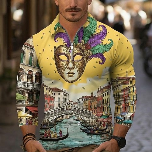 Per uomo Polo Polo con zip Quotidiano Carnevale Bavero Manica Lunga Moda Hawaiano Grafico Maschera Stampa Zip a un quarto Primavera Autunno Vestibilità regolare Giallo Rosso Azzurro Polo