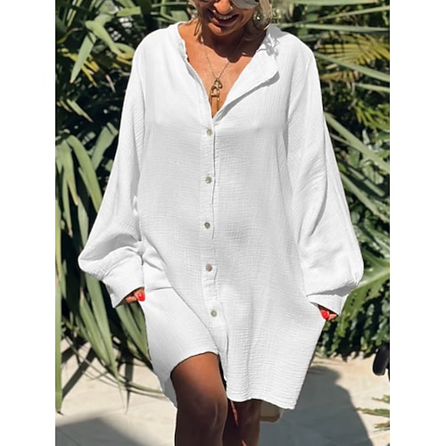 Per donna Mini Abito Abiti ispirati al lino Abito Bianco Abito Camicia Vestito Casual Essenziale Casual Vacanza Quotidiano Vestibilità regolare Semplice Manica Lunga Colletto a Camicia Bianco Azzurro