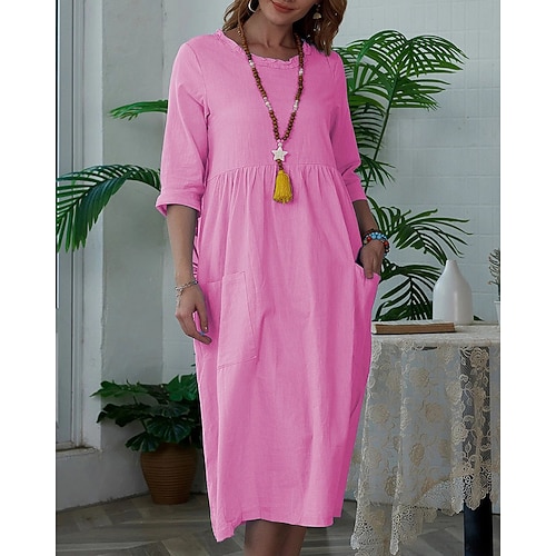 Per donna Abito Midi Vestito Casual Abito in cotone e lino Elegante Moda Moderno Quotidiano Vacanza Uscire Vestibilità comoda Semplice Manica 3/4 Girocollo Giallo Rosa Rosa Azzurro Estate Primavera