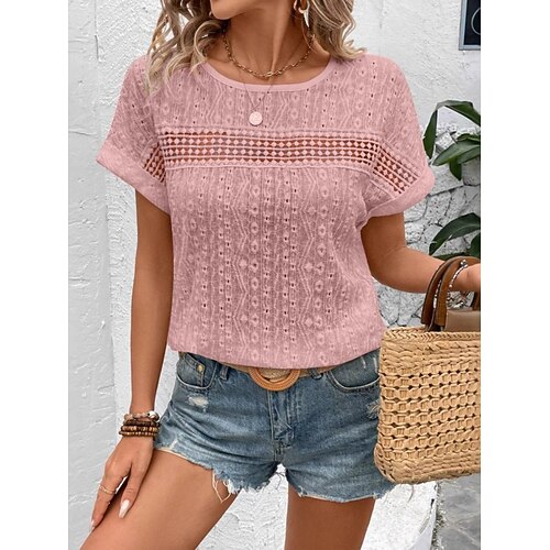 Per donna Maglietta Semplice Moda Elegante Classico Manica Corta Girocollo Top Regolari Quotidiano Weekend Traforato Blu Bianco Rosa Verde Beige Estate
