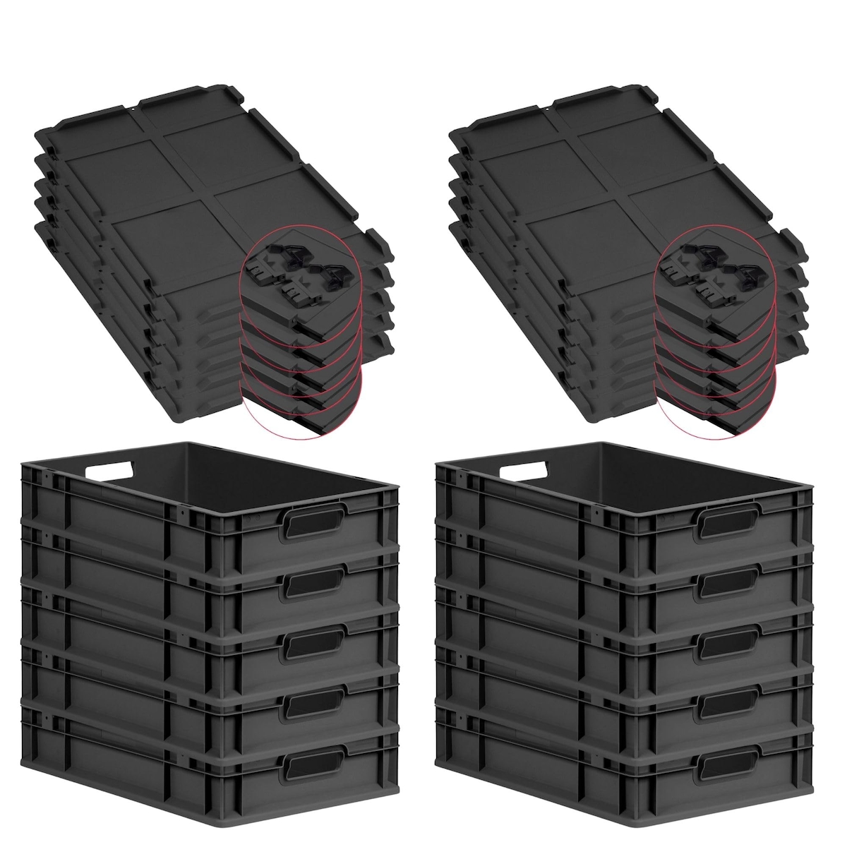 PROREGAL SuperSparSet 10x Eurobox NextGen Grip mit Scharnierdeckel & schwarzen Verschlüssen, HxBxT 12x40x60cm, 23L, Schwarz, Griffe offen, Box