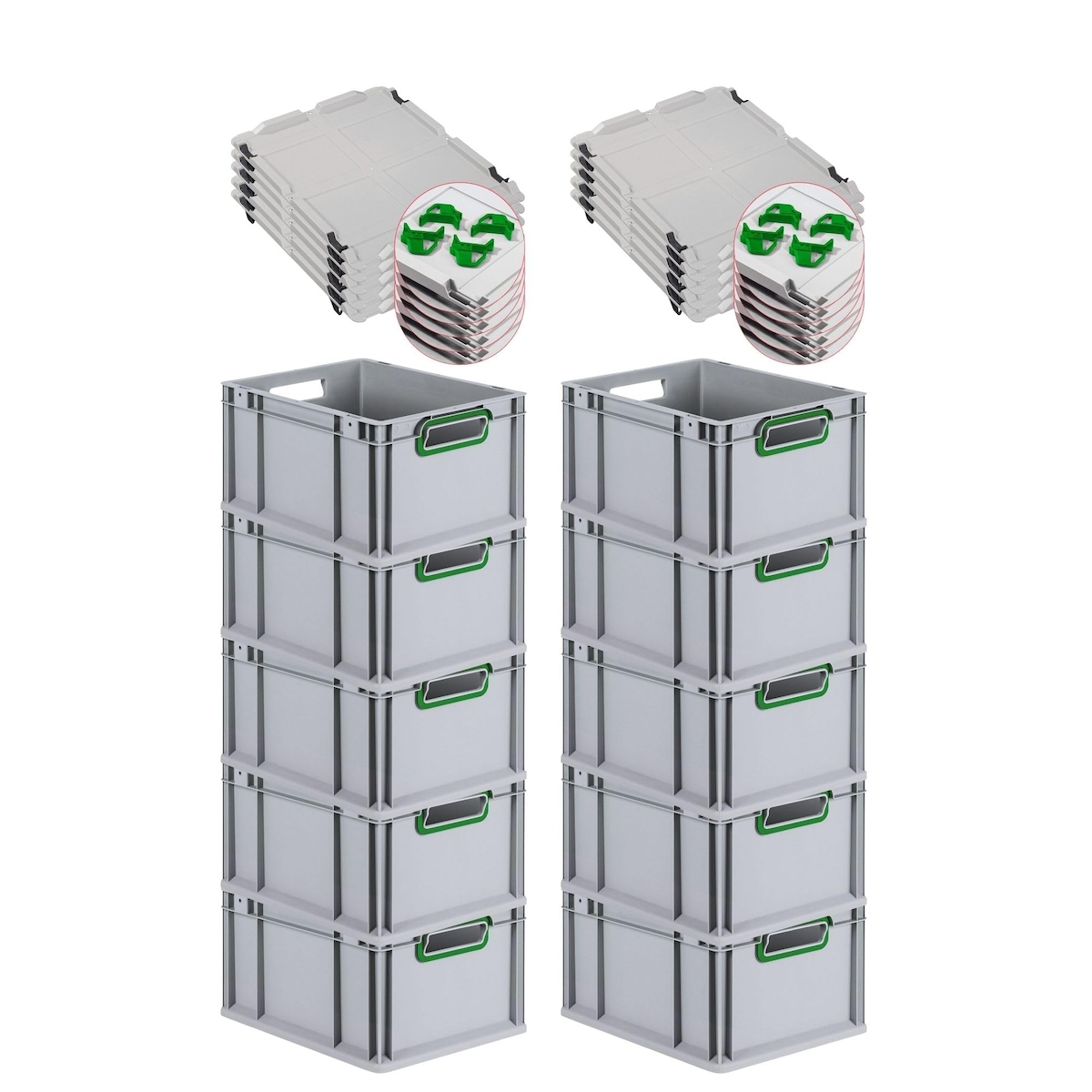 PROREGAL SparSet 10x Eurobox NextGen Color mit Auflagedeckel & Verschlüsse, HxBxT 22x30x40cm, 20L, Grau, Griffe grün offen, Eurobehälter, Box