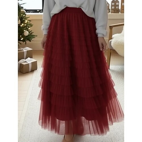 Per donna Linea A Elegante Maxi Misura del girovita medio Gonne Stratificato Inelastico Vinaccia Nero Rosa Marrone Primavera Tulle