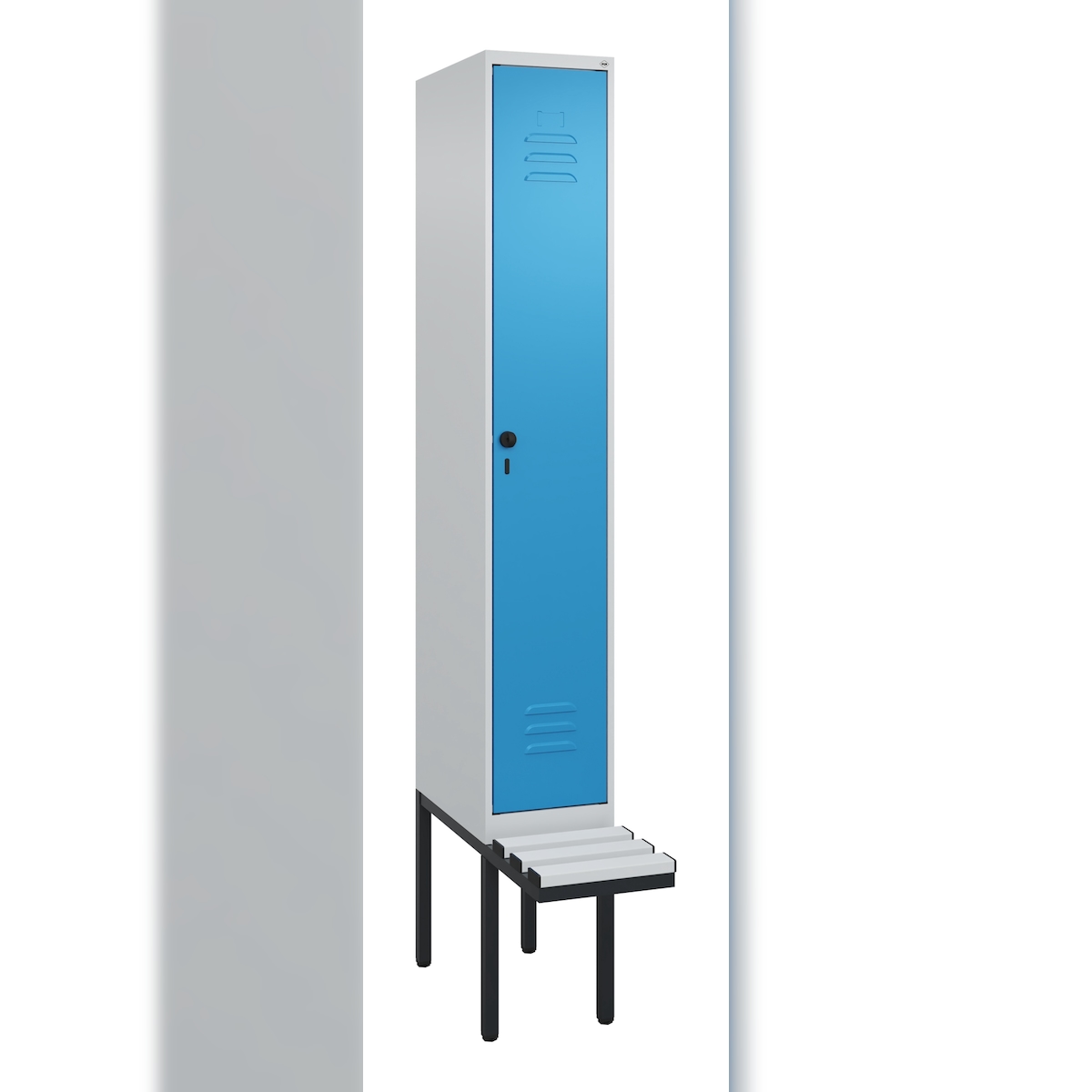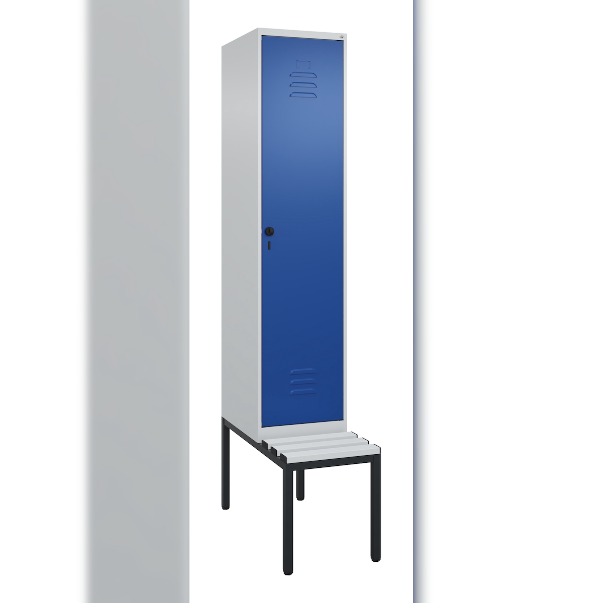 C+P Spind Classic PLUS, Kunststoff untergebaute Sitzbank, 1 Abteil, HxBxT 212x40x82cm, Sicherheitsdrehriegel, Hellgrau/Enzianblau von PROREGAL