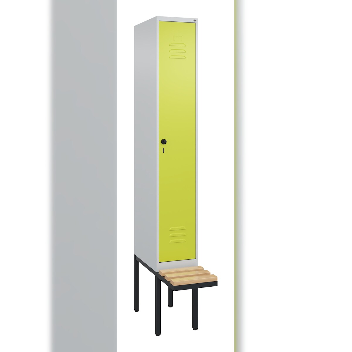 C+P Spind Classic PLUS, schwebender Sitzbank aus Buche 1 Abteil, HxBxT 212x30x82cm, Sicherheitsdrehriegel, Hellgrau/Clowngrün von PROREGAL