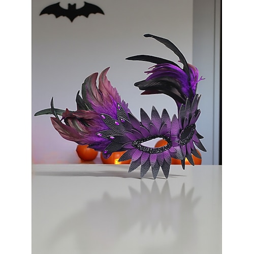 Maschera da donna in piume con motivo a piume colorate, elegante accessorio per costumi di Halloween e cosplay