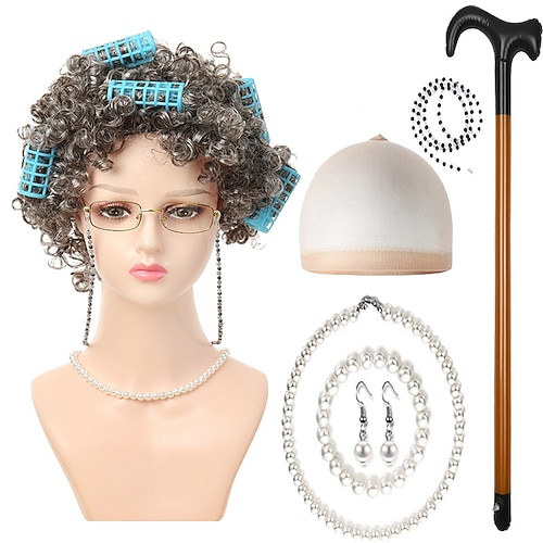 parrucca da vecchia signora con bigodini, collana di perle, orecchini, set di bastoni per donne e ragazze, costume da nonna per cosplay, accessori per feste di Halloween.