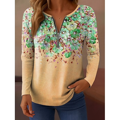Maglietta da donna a manica lunga con zip a quarti Maglietta a manica lunga Casual Floreale Grafica Gradiente Elegante Vintage Stiloso V Collo Top Regolari Quotidiana Gialla Rosa Blu Viola Verde