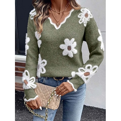 Per donna Felpa Elegante Vintage Carino Floreale Treccia Scollo a V Floreale Manica Lunga Top Regolari Maglia Scuola All'aperto Casa Blu Marrone Primavera Autunno