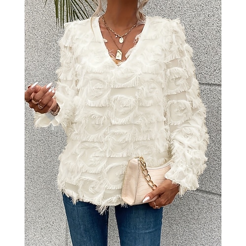 Per donna Camicia Blusa Semplice Elegante Moderno Manica Lunga Scollo a V Top Regolari Quotidiano Ferie Uscire Piuma Nero Bianco Rosa Primavera Autunno