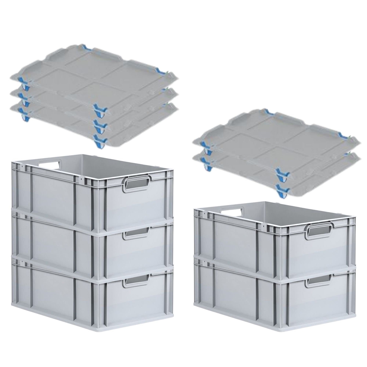 PROREGAL SparSet 5x Eurobox NextGen Economy mit Auflagedeckel & 4x Verschlüsse Blau, Griffe offen, HxBxT 22x40x60cm, 44L, Eurobehälter, Box