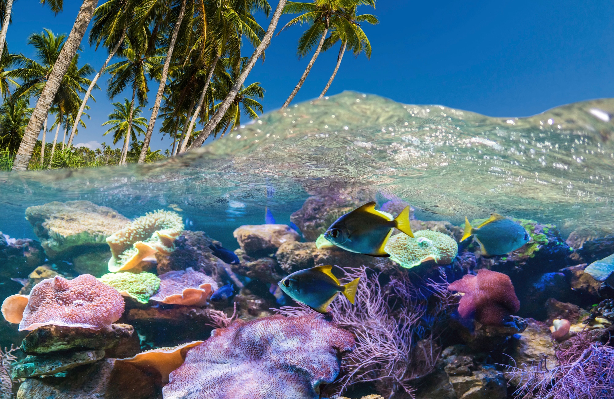 Papermoon Fototapete "UNTERWASSER-WELT-FISCHE KORALLE SEE MEER PALMEN DÜNEN" bunt B/L: 5mm x 2,8mm, Bahnen: 10 Stk. St.