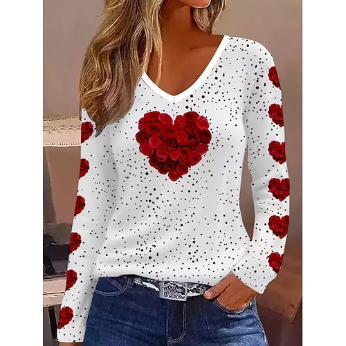 San Valentino Per donna Maglietta Cuore Grafico Vintage Elegante Classico Manica Lunga Scollo a V Top Regolari Quotidiano Stampato Bianco Primavera Autunno Inverno