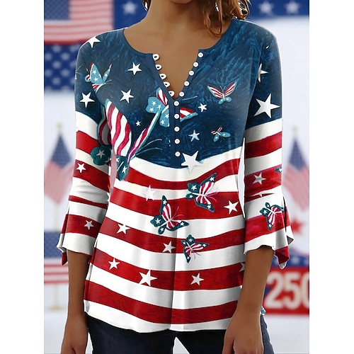 camicetta da donna per il giorno dell'indipendenza americana, grafica, bandiera americana, elegante, alla moda, manica a 3/4, girocollo, top normali, per tutti i giorni, per uscire, bottoni con