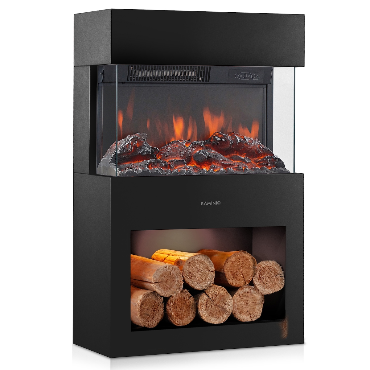 KAMINIO Elektrokamin HENRI - Elektrischer Kaminofen mit Heizung, 3D-Flammeneffekt, LED-Ambientelicht, Holzfach, Fernbedienung - Schwarz
