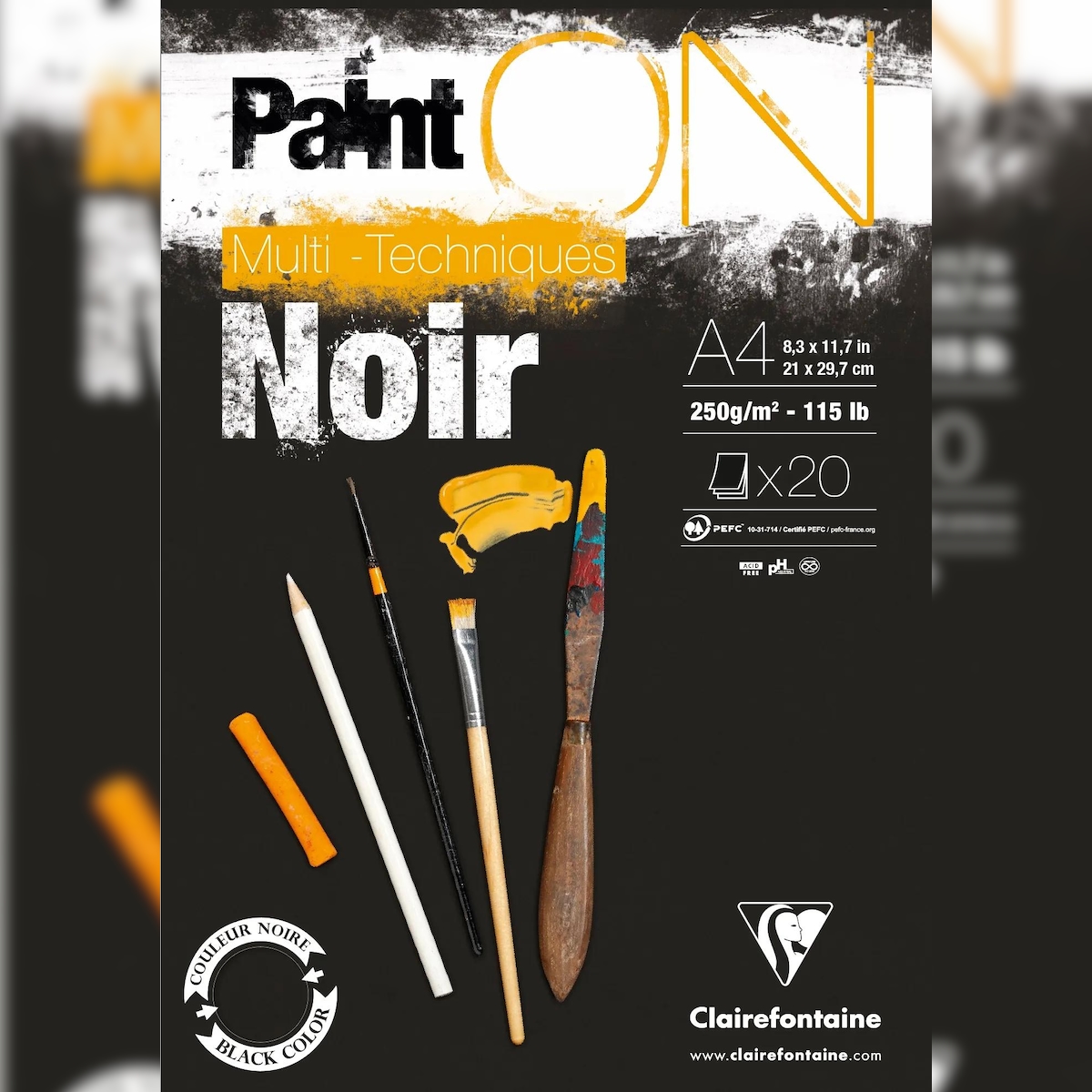 Clairefontaine 4x PaintON Noir, Block A4, kopfseitig geleimt, 20 Blatt, 250g, schwarz, Mixed Media - 975169C