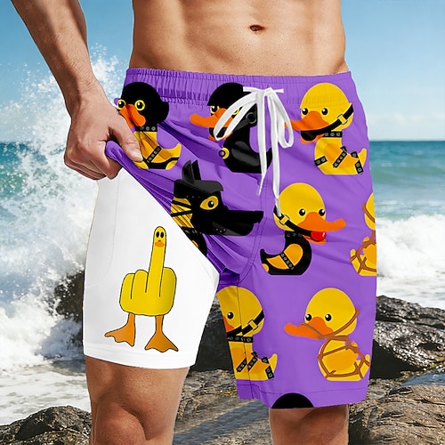 Per uomo Cartoni animati Anatra Dito medio Pantaloncini foderati Pantaloncini da bagno 2 in 1 Pantaloncini da mare Misura del girovita medio Hawaiano Divertente Vacanza al Mare Tasche Laterali Con