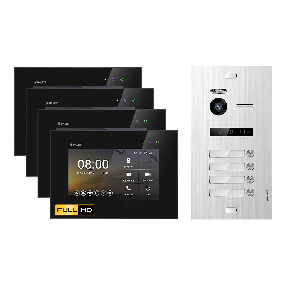 HD Video Türsprechanlage für 4 Familienhaus, 4x Monitor, Balter EVO HD Silber/Schwarz