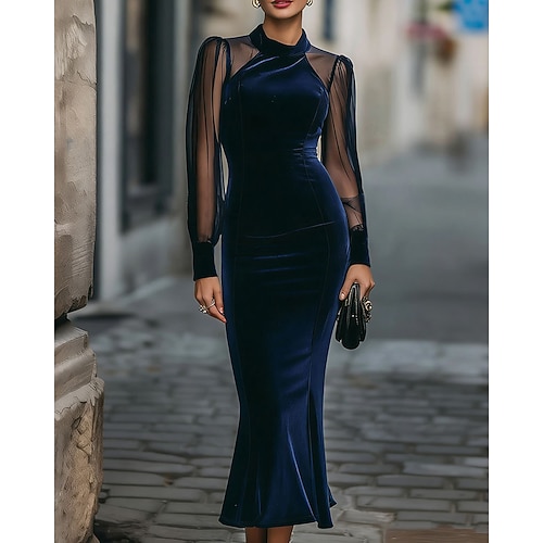 Per donna Abito Lungo Maxi Abito Abito da Ballo Vestito da Festa Tubino Elegante Moda Moderno Festa serale Feste Occasione speciale Vestibilità regolare Semplice Manica Lunga Collo Alto Blu scuro
