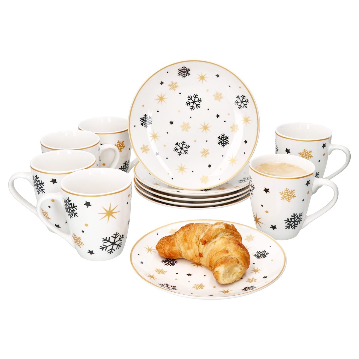 12tlg Frühstücksset Stars schwarz gold Steingut 6 Personen Teller Kaffeebecher