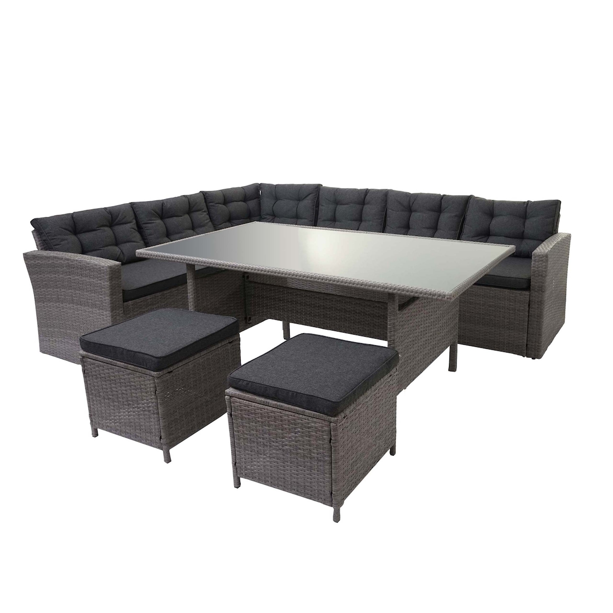 Mendler Poly-Rattan-Garnitur HWC-A29, Gartengarnitur Sitzgruppe Lounge-Esstisch-Set Sofa ~ grau, Kissen grau + 2x Hocker