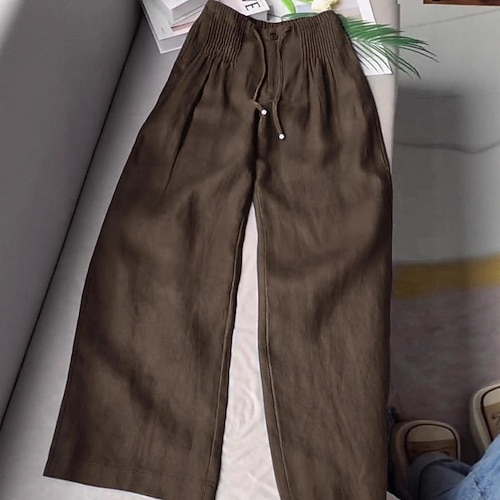 pantaloni da donna in cotone e lino, gamba larga, stile etnico vintage, lunghezza intera, vita alta, tinta unita, anelastici, formali, per le vacanze, azzurro lago, blu riso, bianco, caffè, marrone,