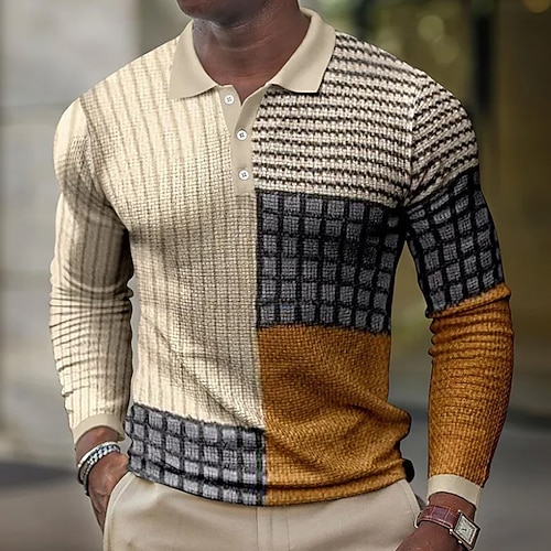 Per uomo Blocco di colori Geometrico Magliette Polo a Nido d'Ape Manica Lunga Magliette polo Camicie con Colletto Business Casual Affari Abbigliamento da lavoro Abbigliamento quotidiano Bottoni