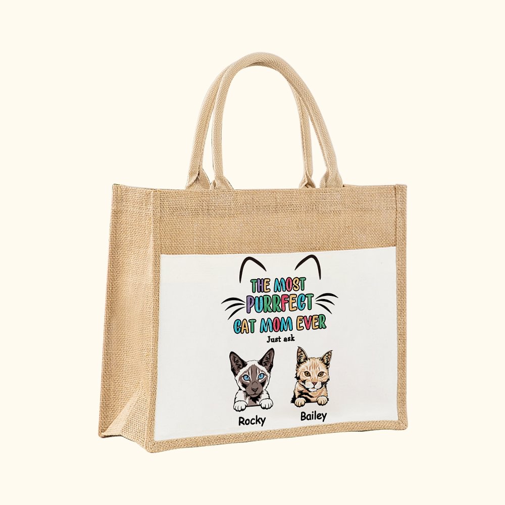 Personalisierte die meisten Purrfect Katze Mama jemals Jute Tasche mit Fronttasche und 1-6 Katzennamen Tote Bag Geburtstag Reisezubehör Geschenk