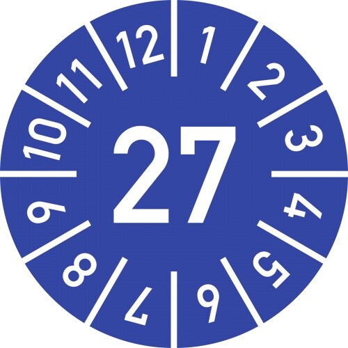 Dreifke® Prüfplakette Jahr 27 mit Monaten, blau, Folie-Spezialkl., Ø 25 mm, 10 St./Bo.