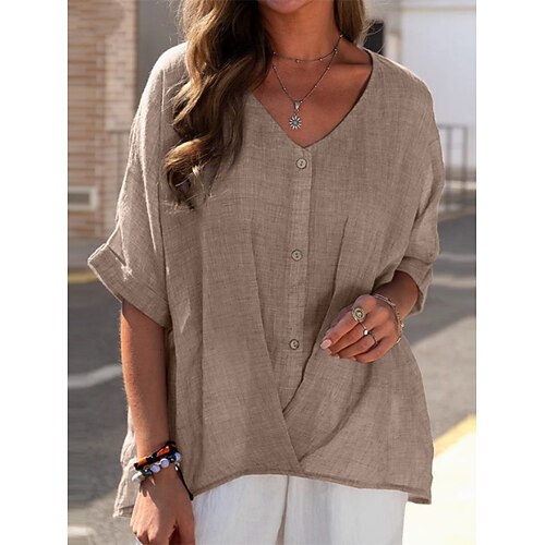 Per donna Camicia Camicie ispirate al lino Abbottonare Blusa Tinta unica Essenziale Casual Manica 3/4 Scollo a V Top Regolari Quotidiano Bottoni Rosa Blu Cachi Autunno Inverno