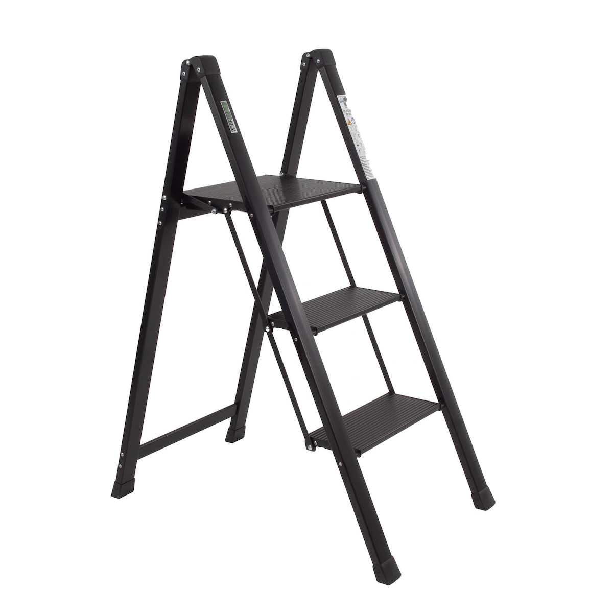 Baumarktplus Trittleiter 3-stufig klappbar TÜV/GS 150 kg Anti-Rutsch Trittflächen Klapptritt Leiter in schwarz