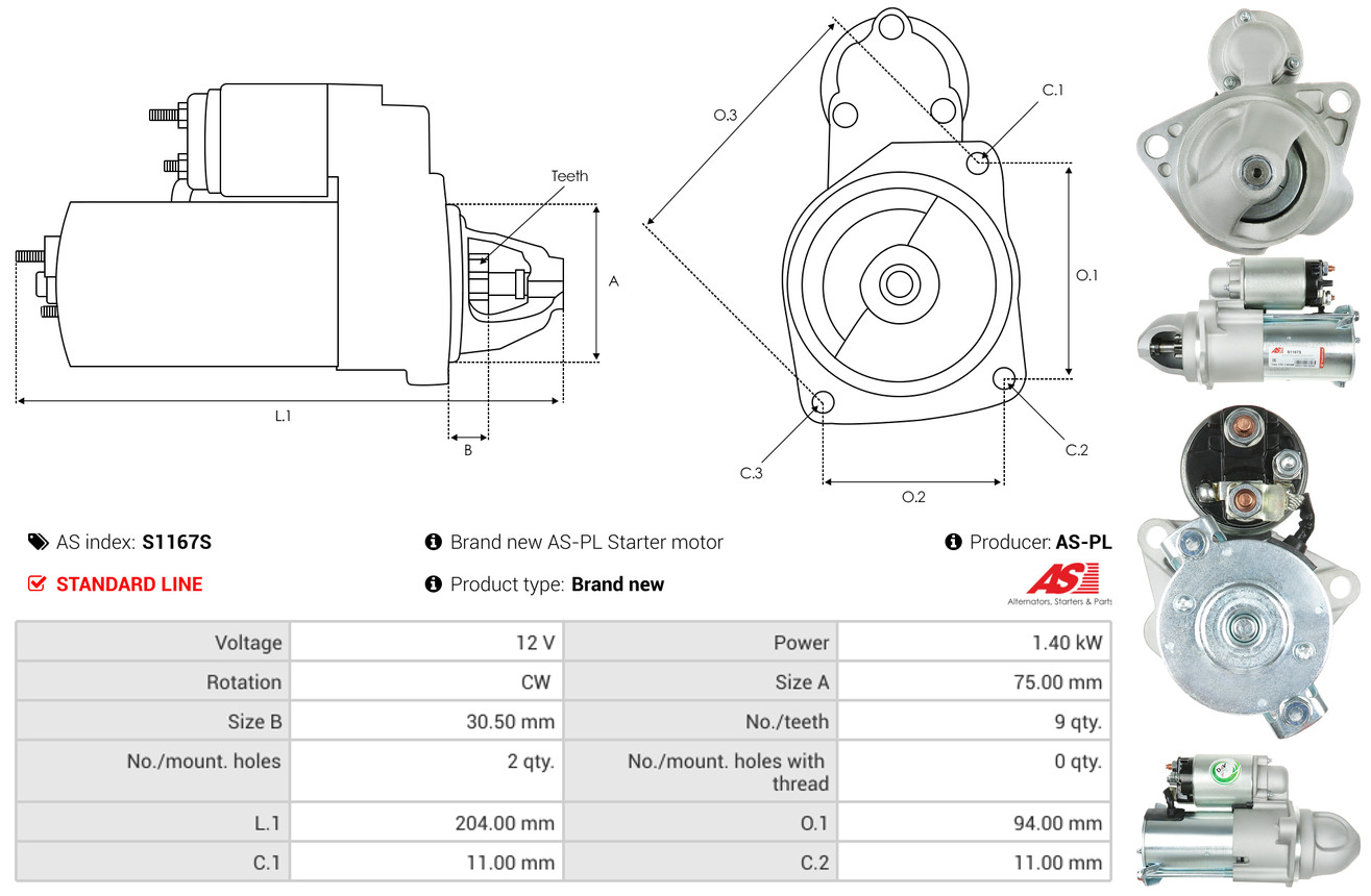 AS-PL Starter S3091 12V für MITSUBISHI PEUGEOT GENERAL MOTORS TOYOTA BMW OPEL M000T22472 M000T22473 M000T22471