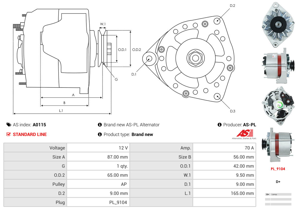 AS-PL Generator A0115 12V 70A für GENERAL MOTORS OPEL 3493320 9512118 1204040