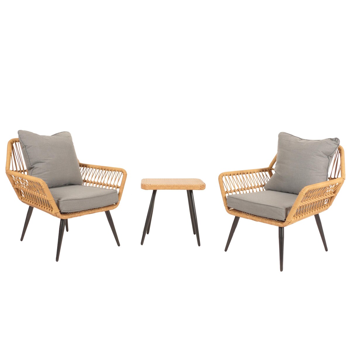 Mendler Poly-Rattan Garnitur HWC-N33, Balkon-Set Gartengarnitur Sitzgruppe Stuhl Beistelltisch ~ naturfarben, Polster hellgrau
