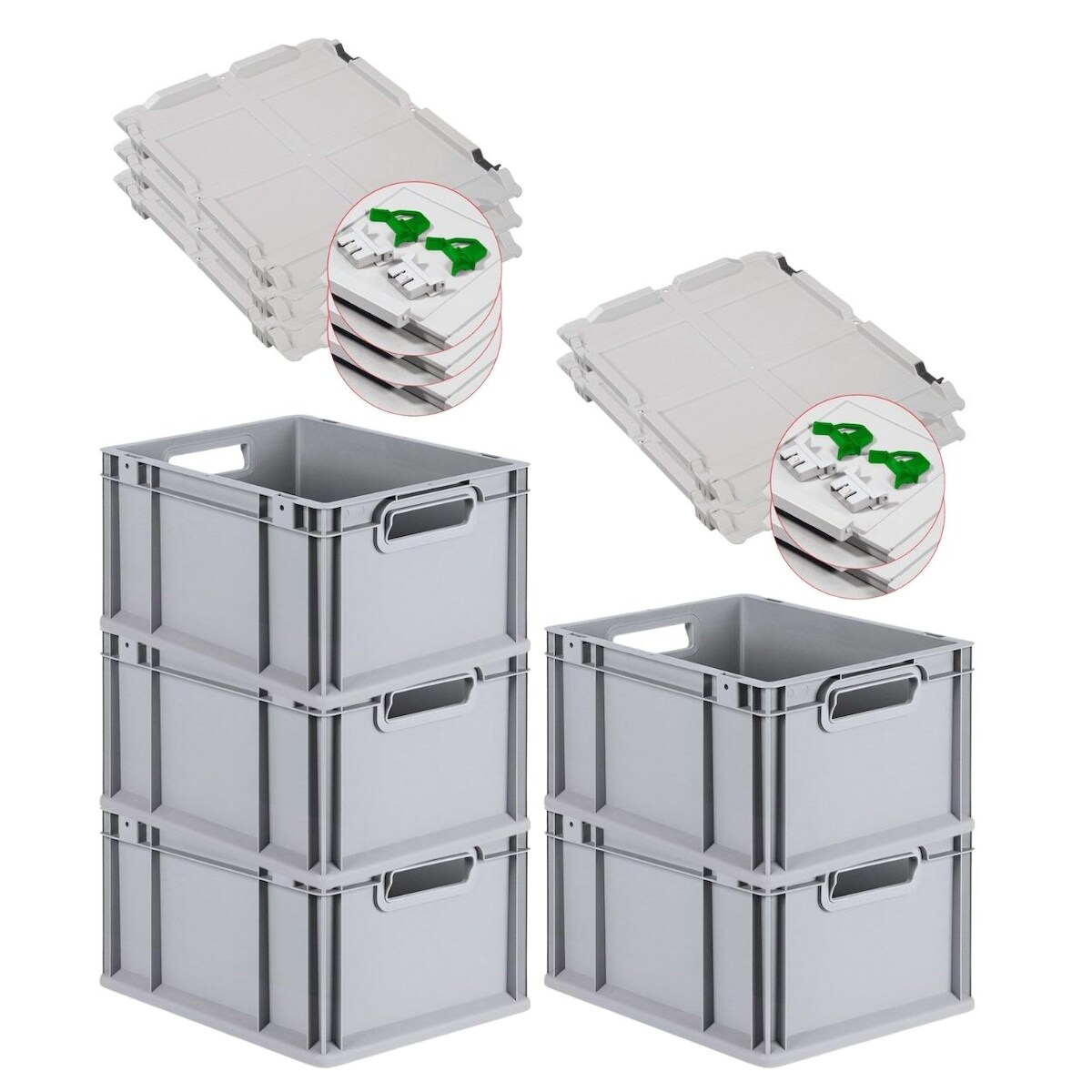 PROREGAL 5x Eurobox NextGen Grip mit Scharnierdeckel & grünen Verschlüssen | HxBxT 22x30x40cm | 20 Liter | Griffe offen | Glatter Boden