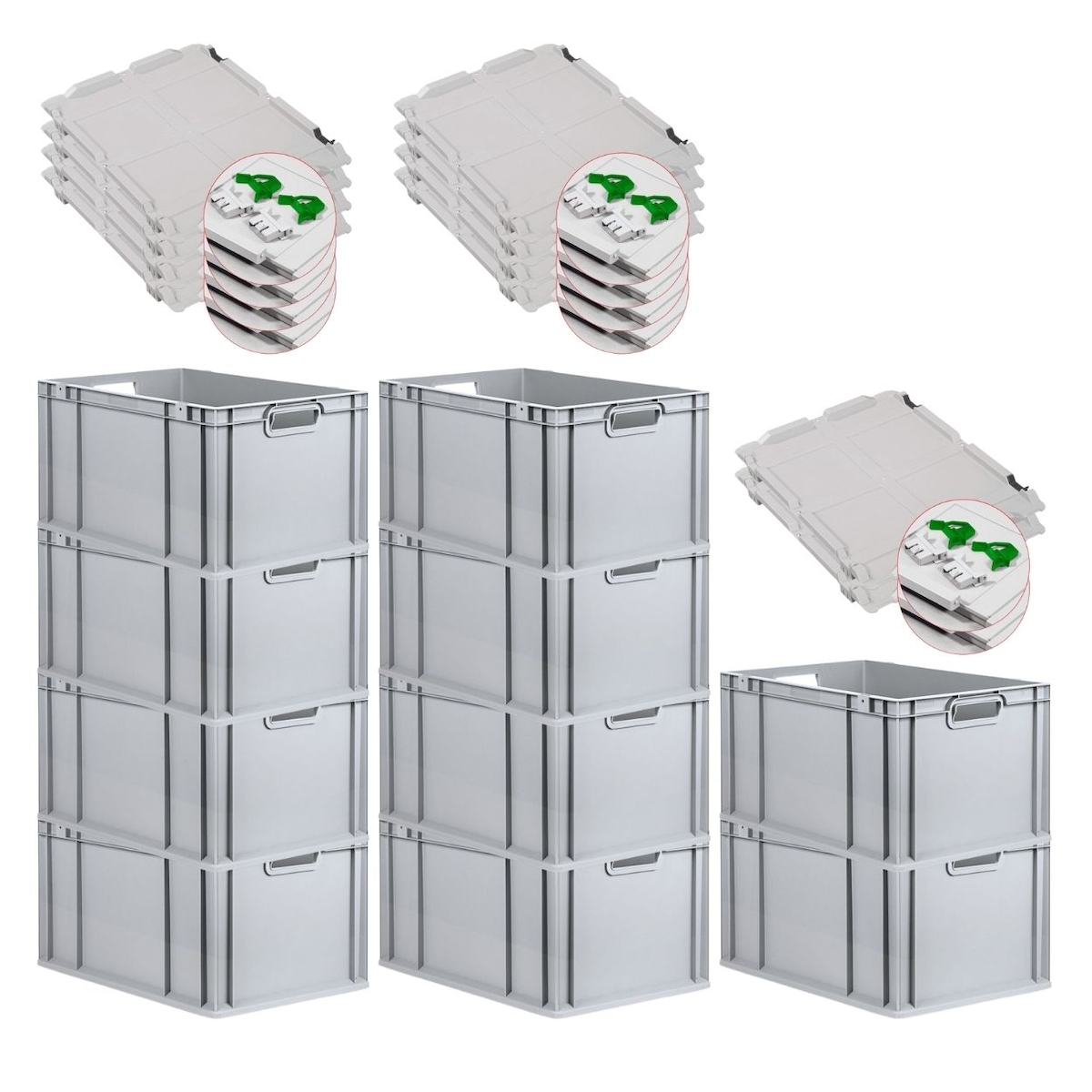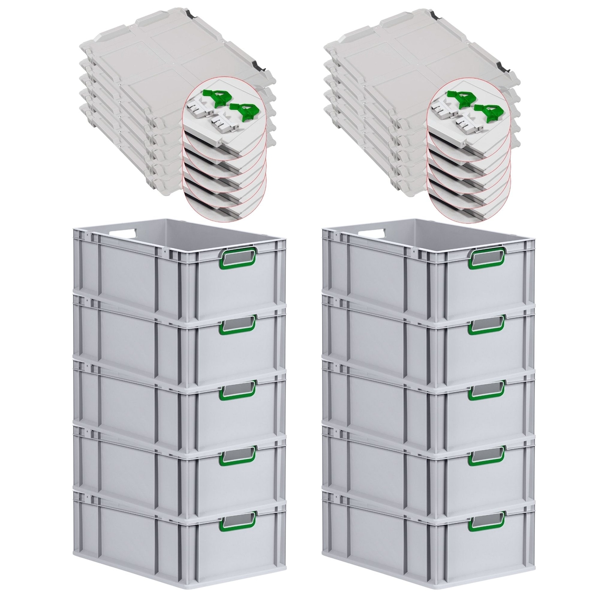 PROREGAL 10x Eurobox NextGen Grip mit Scharnierdeckel & grünen Verschlüssen | HxBxT 32x40x60cm | 65 Liter | Griffe offen | Verstärkter Boden