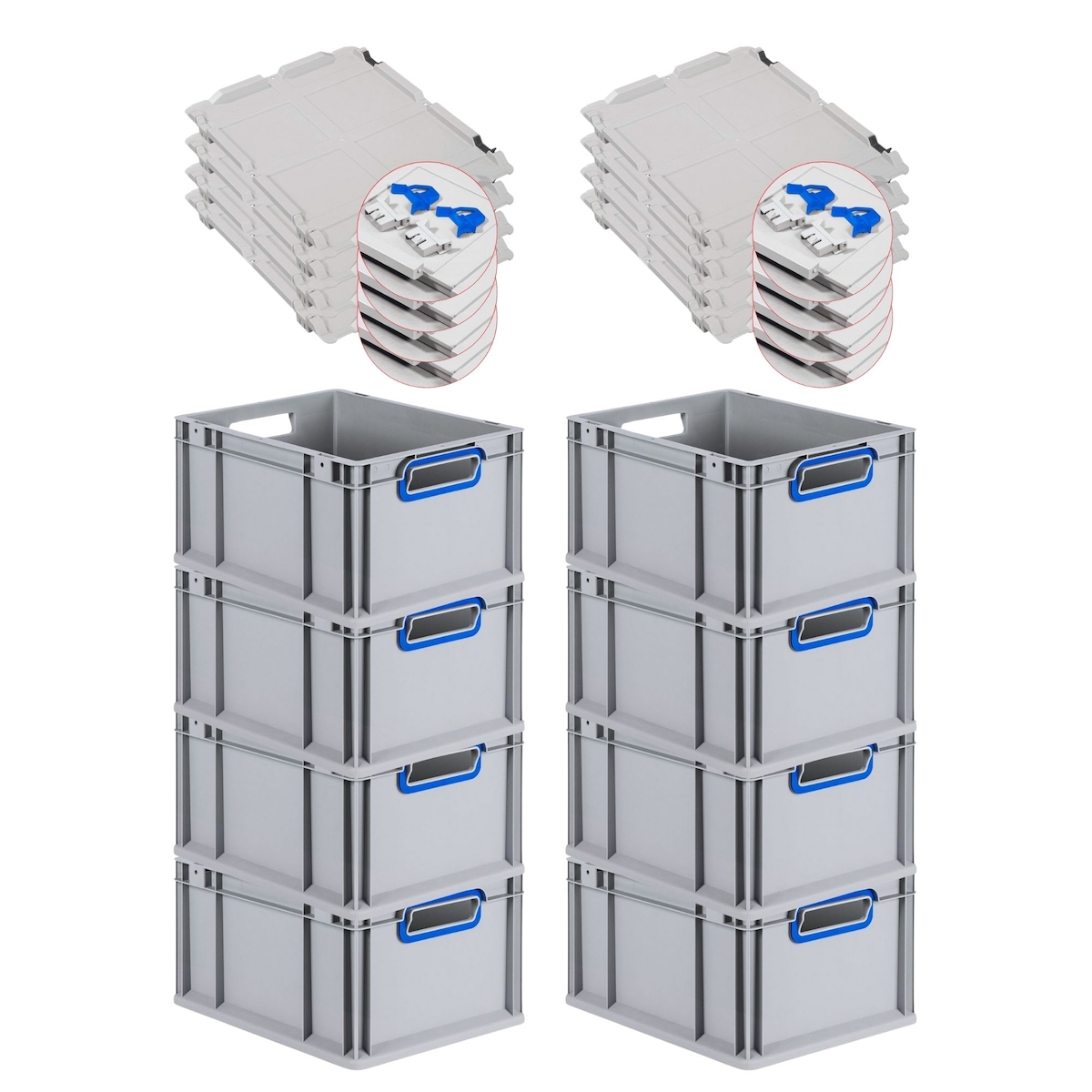 PROREGAL 8x Eurobox NextGen Color mit Scharnierdeckel & Verschlüssen | HxBxT 22x30x40cm | 20 Liter | Griffe blau offen | Glatter Boden