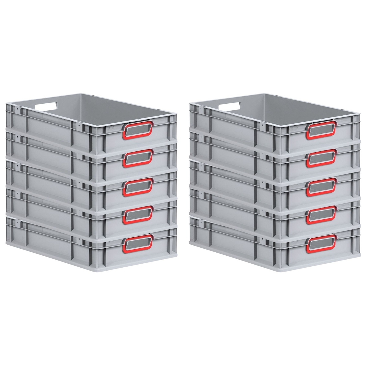 PROREGAL 10x Eurobox NextGen Grip mit Scharnierdeckel & roten Verschlüssen | HxBxT 17x40x60cm | 34 Liter | Griffe offen | Glatter Boden