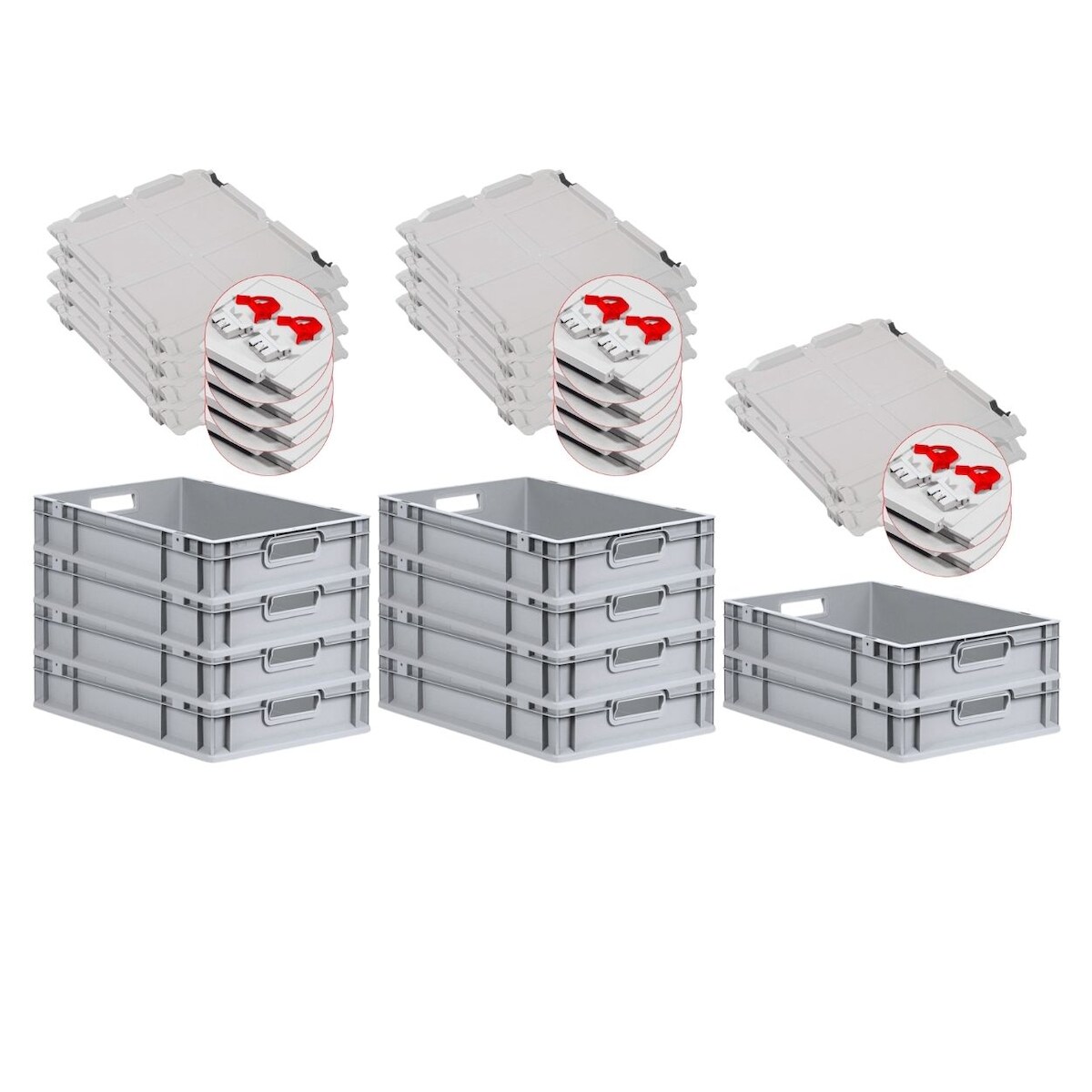 PROREGAL 10x Eurobox NextGen Grip mit Scharnierdeckel & roten Verschlüssen | HxBxT 12x40x60cm | 23 Liter | Griffe offen | Glatter Boden