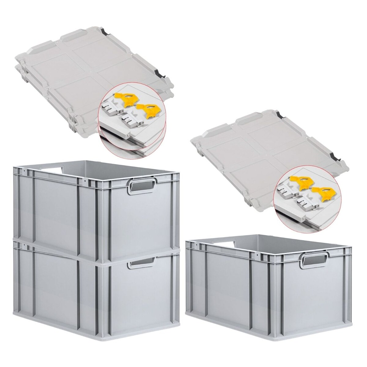 PROREGAL 3x Eurobox NextGen Grip mit Scharnierdeckel & gelben Verschlüssen | HxBxT 32x40x60cm | 65 Liter | Griffe offen | Verstärkter Boden