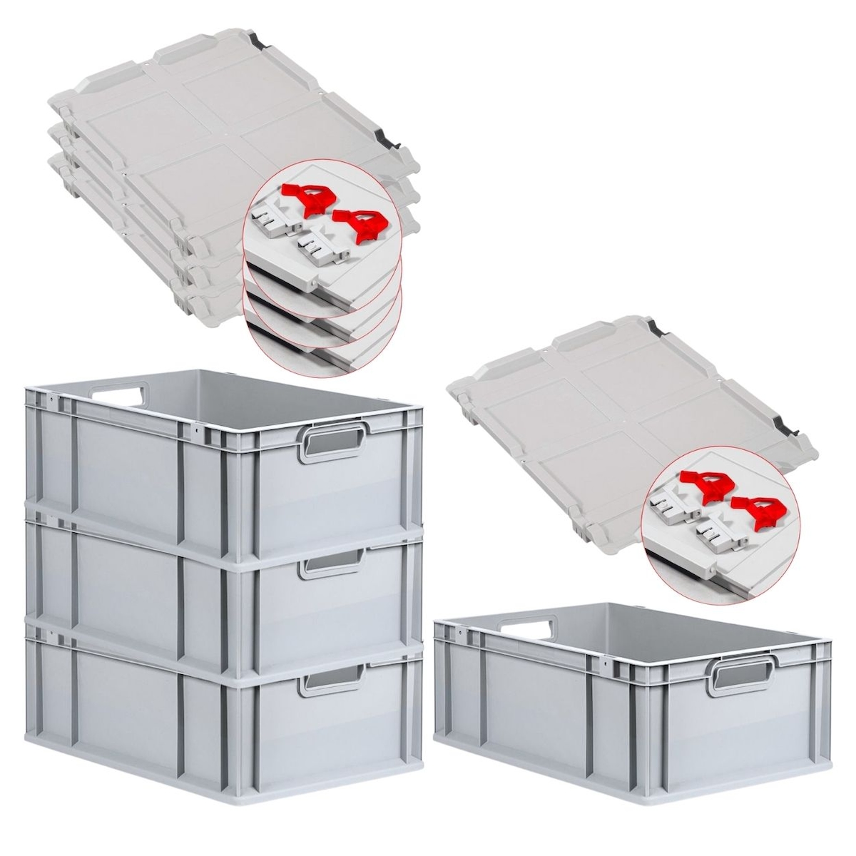 PROREGAL 5x Eurobox NextGen Grip mit Scharnierdeckel & roten Verschlüssen | HxBxT 17x40x60cm | 34 Liter | Griffe offen | Glatter Boden