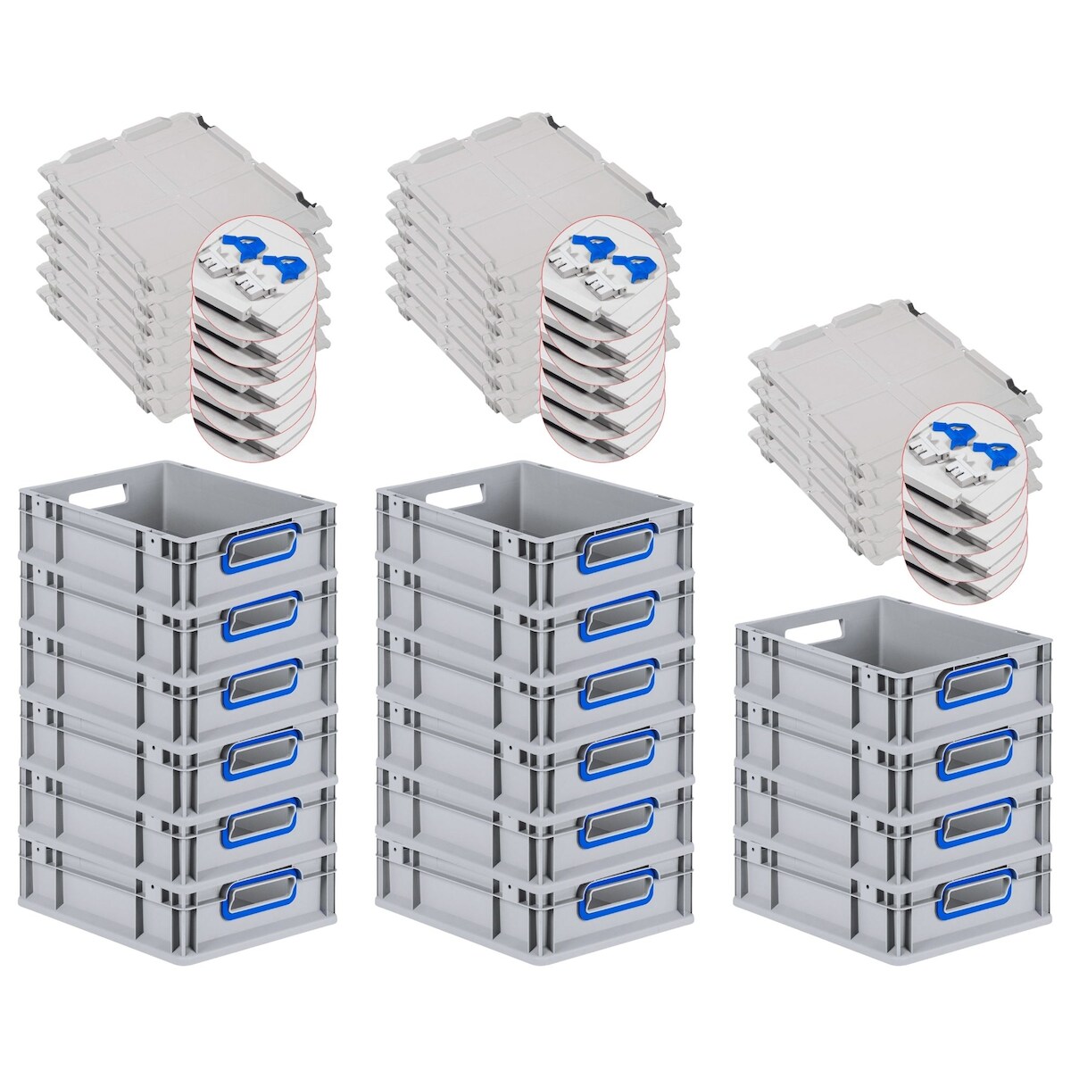 PROREGAL 10x Eurobox NextGen Grip mit Scharnierdeckel & blauen Verschlüssen | HxBxT 32x30x40cm | 30 Liter | Griffe offen | Glatter Boden