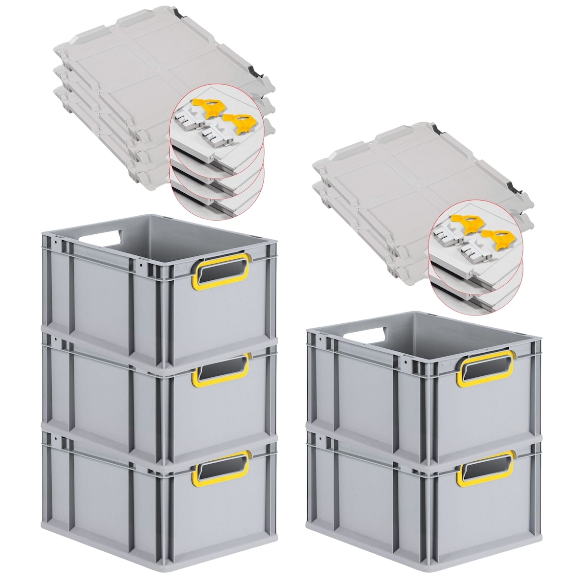PROREGAL 4x Eurobox NextGen Grip mit Scharnierdeckel & gelben Verschlüssen | HxBxT 32x30x40cm | 30 Liter | Griffe offen | Glatter Boden