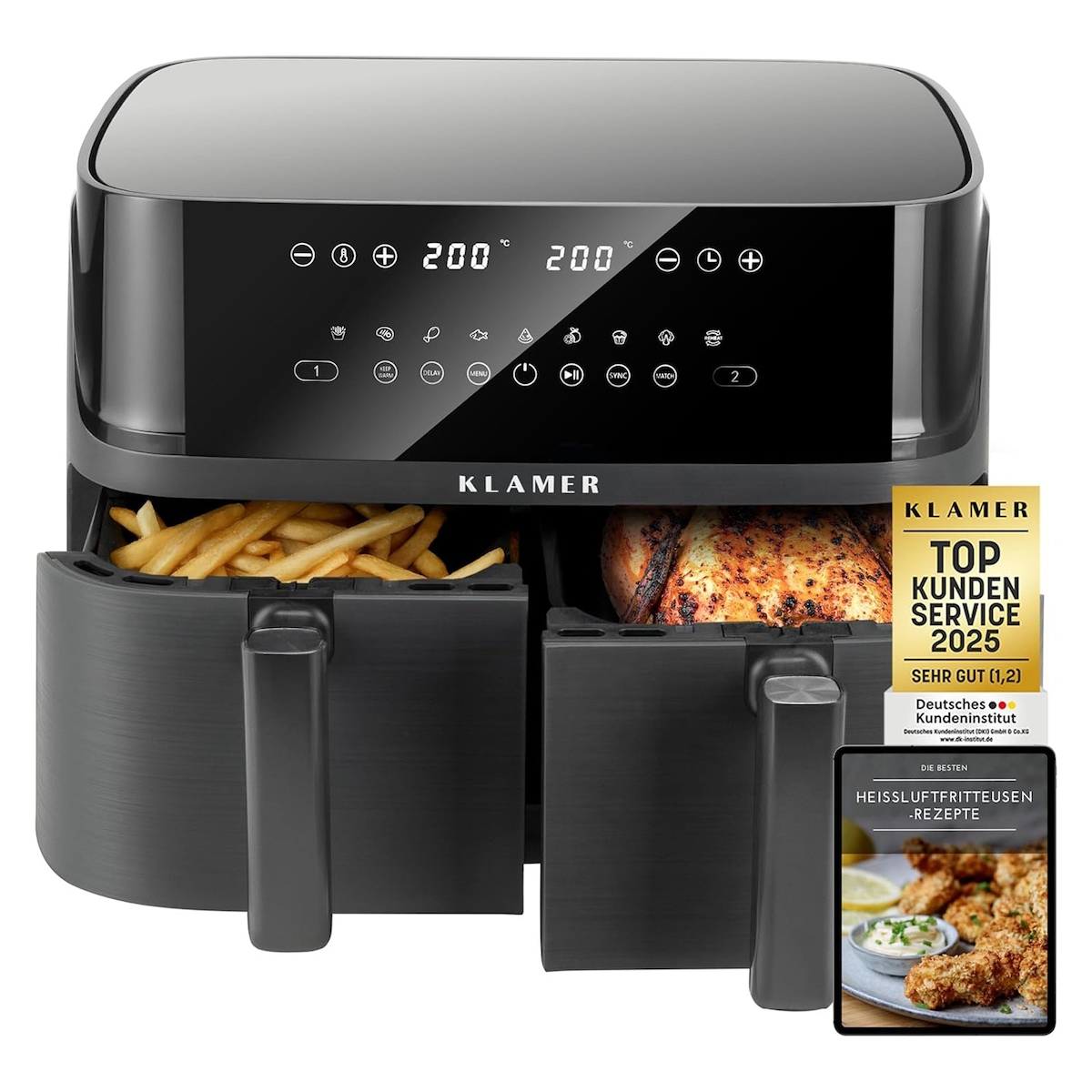 KLAMER Heißluftfritteuse Duo 9 L – Doppelkammer Airfryer mit 2 Körben & Digitaldisplay, 10 Automatikprogramme, Dual-Funktion, Timer, 3000 W Heißluft-…