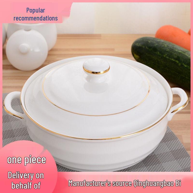 White Ceramic Double-Eared Soup Pot with Lid, Large Capacity Stew and Rice Bowl, Microwave Safe Steamed Egg Basin.