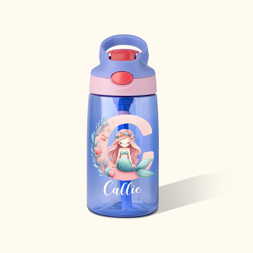 Botella de agua para niños con pajita y tapa antiderrame personalizada Fantasy Mermaid Initial Number 16 oz Birthday Back to School Gift for Girls
